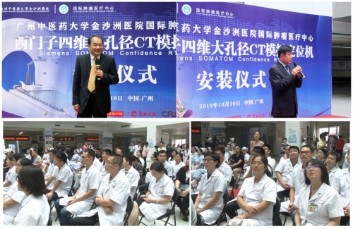 国内首台西门子双光子四维大孔径CT模拟定位机安装仪式在广州中医药大学金沙洲医院一楼门诊大厅隆重举行。广州中医药大学金沙洲医院国际肿瘤医疗中心院长刘文胜、广州中医药大学金沙洲医院国际肿瘤医疗中心副院长王洋,西门子公司销售经理吴书韵,西门子公司设备现场总工程师林涛等领导嘉宾和国际肿瘤医疗中心全体医护人员近60人参加仪式。广东电视台、南方日报、广州日报、羊城晚报等近百家媒体全程跟踪采访报道。